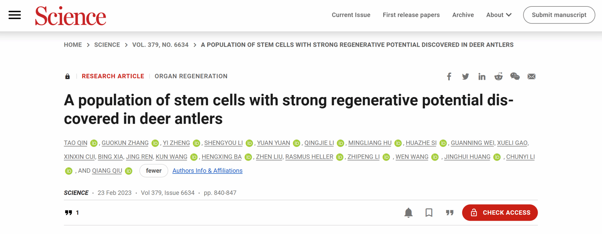 2023年2月24日(北京时间),Science(《科学》)杂志在线发表了十点半 与国内外多家单位共同完成的题为“A population of stem cells with strong regenerative potential discovered in deer antlers”的论文。十点半 2020级博士研究生秦涛为论文的第一作者,十点半 邱强教授和王文教授,以及相关单位的研究人员为论文的通讯作者。