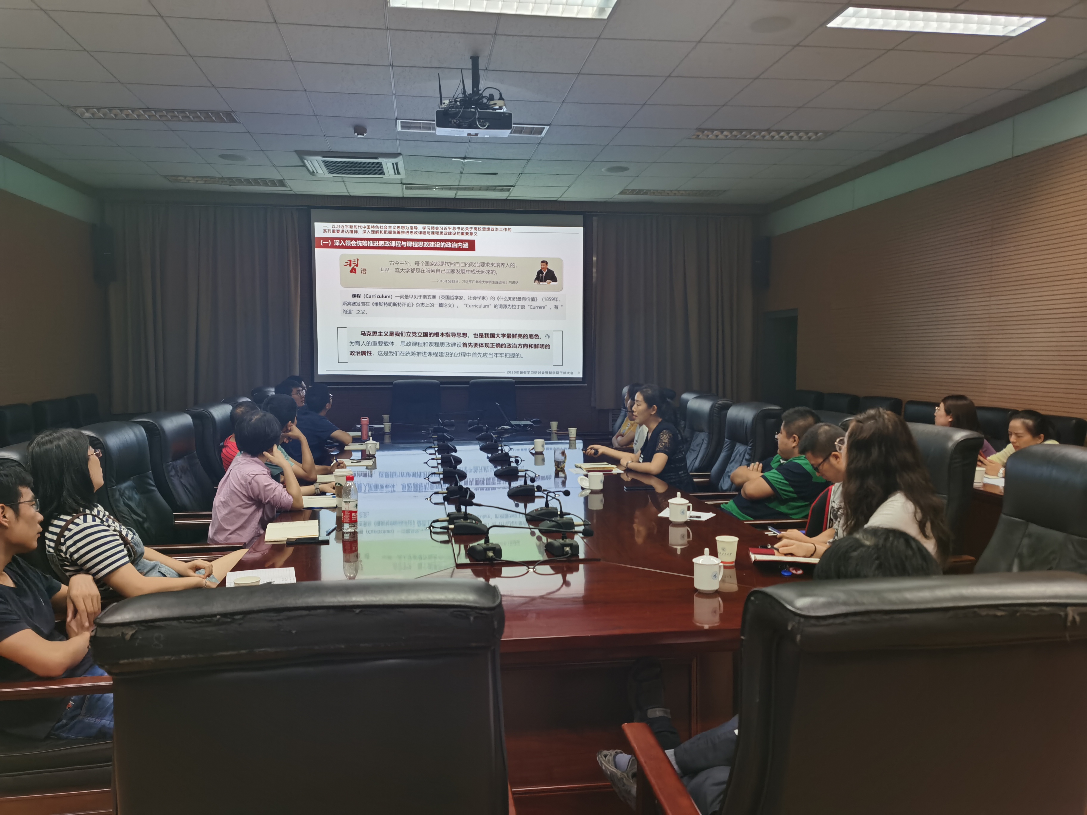 牟蕾带领大家一同学习了汪劲松校长新学期干部大会的讲话精神,传达了汪劲松校长关于课程思政和思政课程要同向同行的核心精神,指出要将价值塑造作为首要任务,深入贯彻落实立德树人。此外,牟蕾向全院青年教师解读了十点半