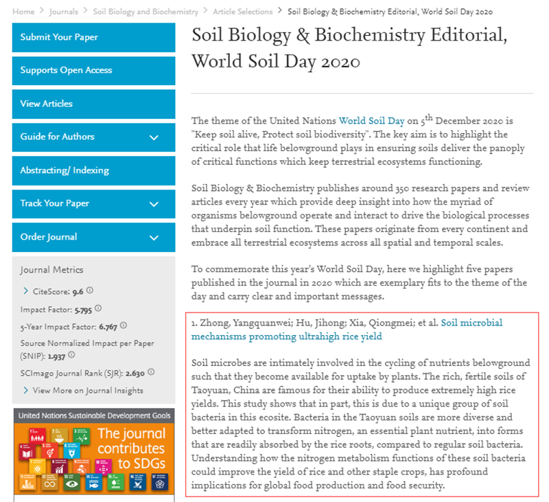 社论指出,《土壤生物学和生物化学》每年发表约350篇研究论文和综述,该高亮论文揭示了一个著名的水稻超高产地点——云南省永胜县涛源乡的土壤里有较高的细菌多样性以及能更有效把氮转化为植物易于利用形式的菌落,从而对此地的水稻超高产有重要作用,该论文“对全球粮食生产和粮食安全有深远意义”(has profound implications for global food production and food security)。