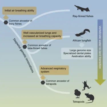 硬骨鱼类祖先中已经出现空气呼吸能力和空气嗅觉的分子基础;后续硬骨鱼类进化的一个分支肉鳍鱼类中出现了更多呼吸相关基因和功能元件,使得它们的空气呼吸能力进一步加强;肉鳍鱼类进化的一个分支四足动物进化出了更多基因和功能元件从而具备了完备的空气呼吸能力,成功摆脱水的桎梏。