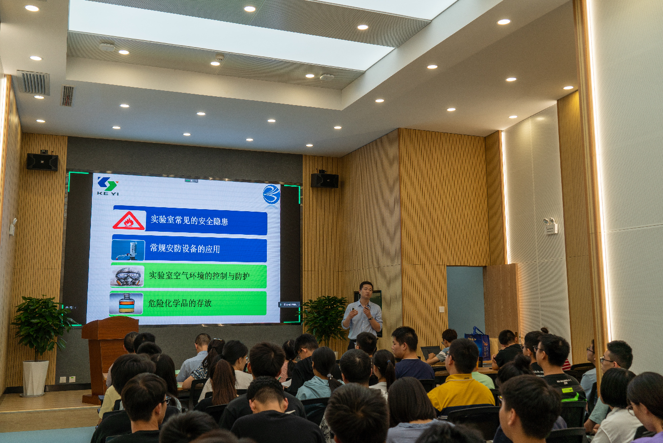随后,陕西科仪公司总工程师刘涛从实验室常见的安全隐患、常规安防设备的应用、实验室空气环境的控制与防护、危险化学品的存放等方面进行了详细专业的讲解。针对实验室常用的水、电、气、火、试剂基本安全操作和安全防范措施,及有关化学、微生物基本操作及安全防范等内容,结合十点半