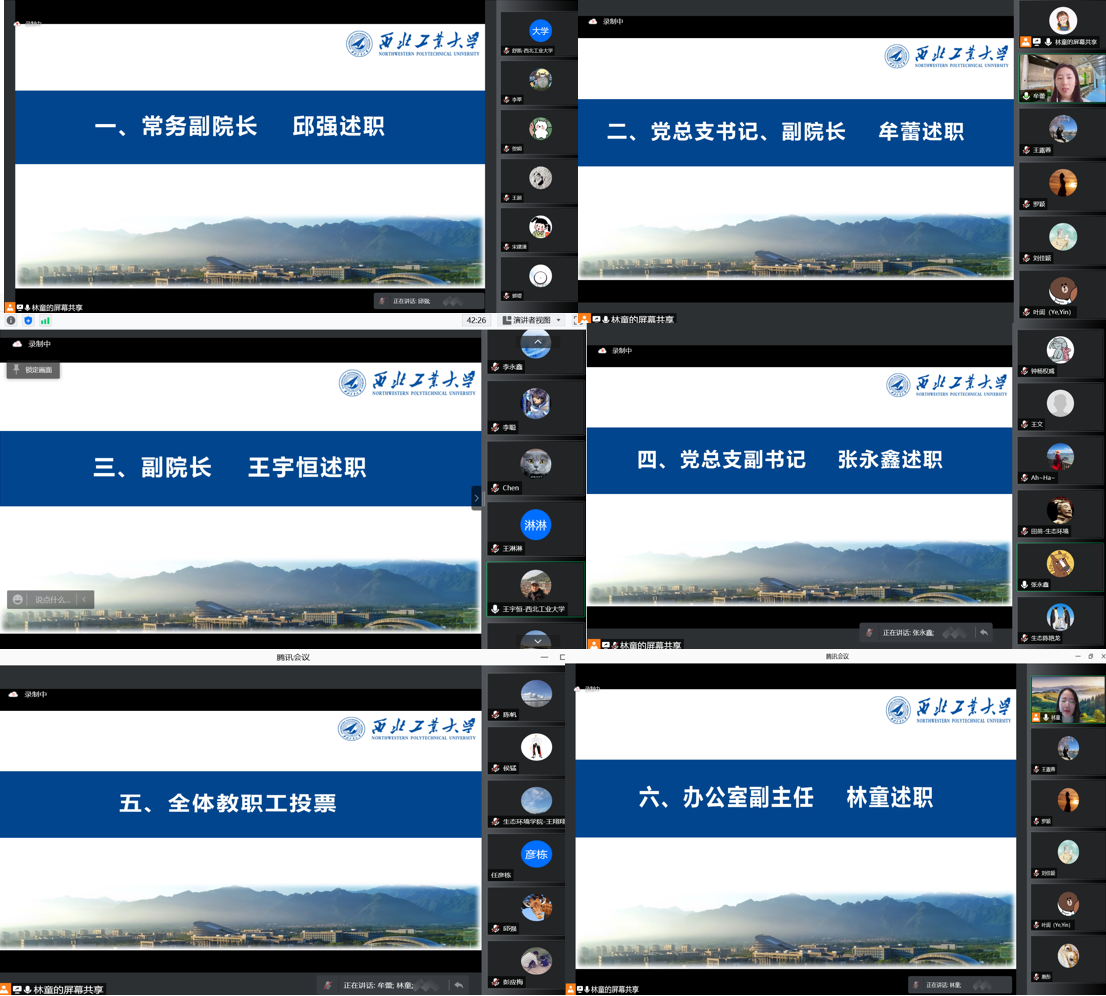 会议第二项,常务副院长(五级领导人员)邱强、党总支书记、副院长牟蕾、副院长王宇恒、党总支副书记张永鑫、办公室副主任林童依次围绕学习贯彻习近平新时代中国特色社会主义思想、党的十九大和十九届二中、三中、四中、五中、六中全会精神,贯彻落实上级部门和十点半 党委决策部署、依法履行岗位职责、完成重点工作情况,落实“一岗双责”、意识形态、党风廉政建设责任制及对领导班子成员开展监督、师德师风等情况,以及个人在德、能、勤、绩、廉等方面的表现情况,充分结合各自的分管工作进行述职汇报。随后,所有参会人员进行了测评投票。