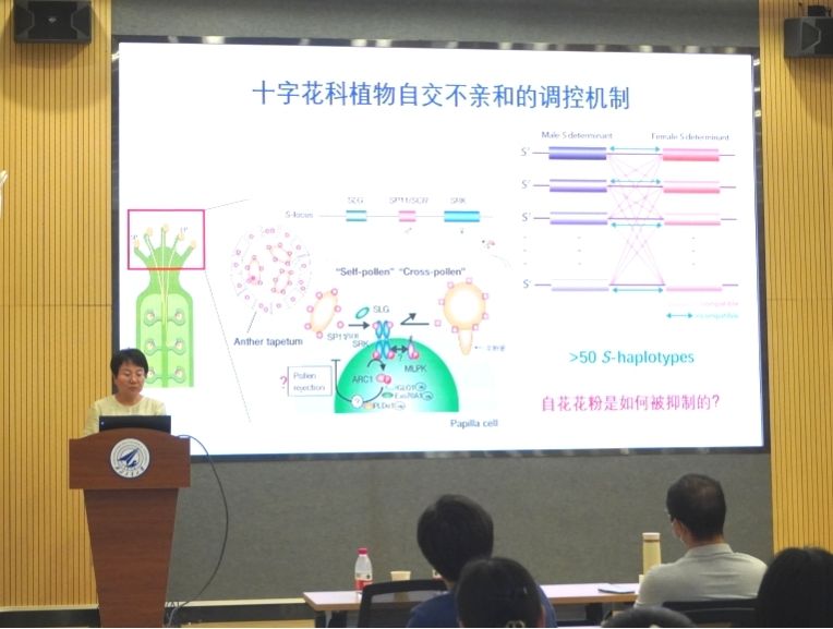 接着段巧红教授就如何加强远缘杂交育种理论及技术研究重点展开论述,并提出要充分利用远缘物种的基因资源创制突破性种质,培育新品种。研究团队发现柱头 S-位点受体激酶(SRK) 能识别种间花粉,招募FERONIA 受体激酶(FER)并激活其介导的活性氧(ROS)在自交不亲和(SI)柱头中产生,以排斥不亲和的花粉。研究结果表明,SRK 和 FER 整合了种内和种间障碍的基本机制,为实现十字花科作物的远缘育种提供了途径。