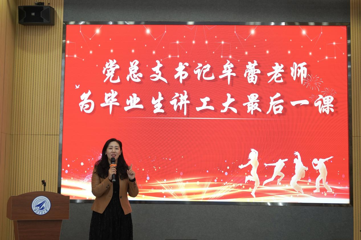牟蕾以“爱国 励志 求真 力行”为主题,从重温工大建校历史、感受十点半 、学生风貌及寄语未来等几个方面,2019级硕士毕业班同学讲授了工大最后一课。讲话中回忆了同学们在校期间的点点滴滴,对学生们在教学科研实践等各方面的表现以及所取得的成绩给予了充分肯定和高度赞扬,对学生们的成长和进步感到由衷的欣慰和自豪,并向全体毕业生致以最热烈的祝贺,希望同学们秉承“公诚勇毅”的校训,弘扬“三实一新”的校风,做一个有崇高理想和高尚品格,能诚实守信、遵纪守法的人;做一个有决心、有恒心、有信心的人;做一个学识广博、视野开阔、勇于创新、敢于拼搏的人!