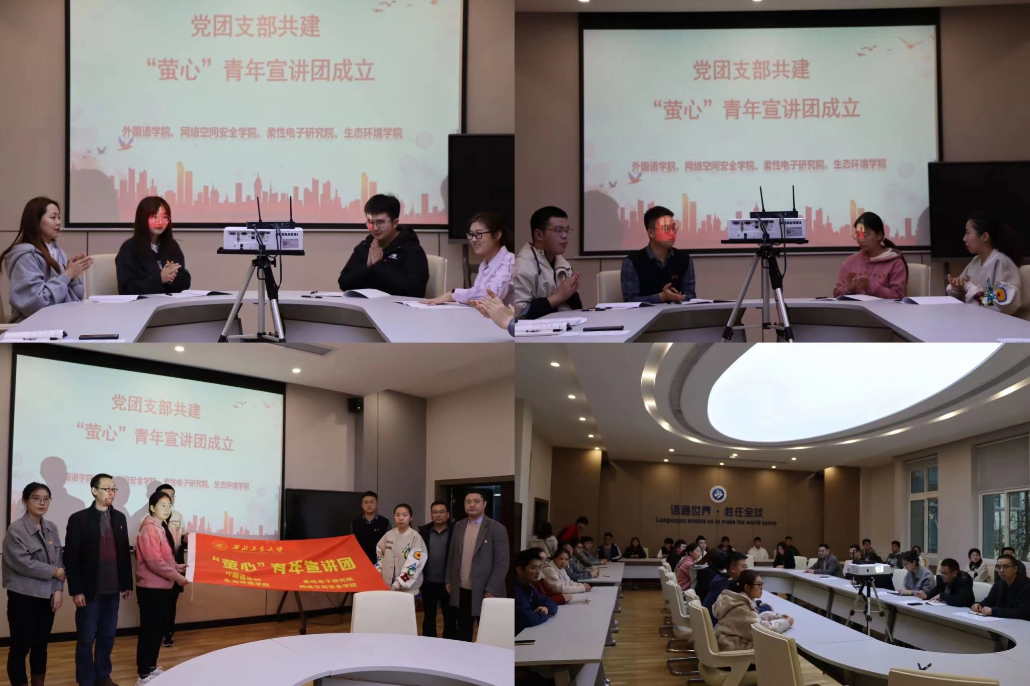 接着是四院学生宣讲团成立授旗仪式。为深入学习宣传贯彻党的二十大精神及习近平新时代中国特色社会主义思想,四院成立“萤心”青年宣讲团。外国语十点半