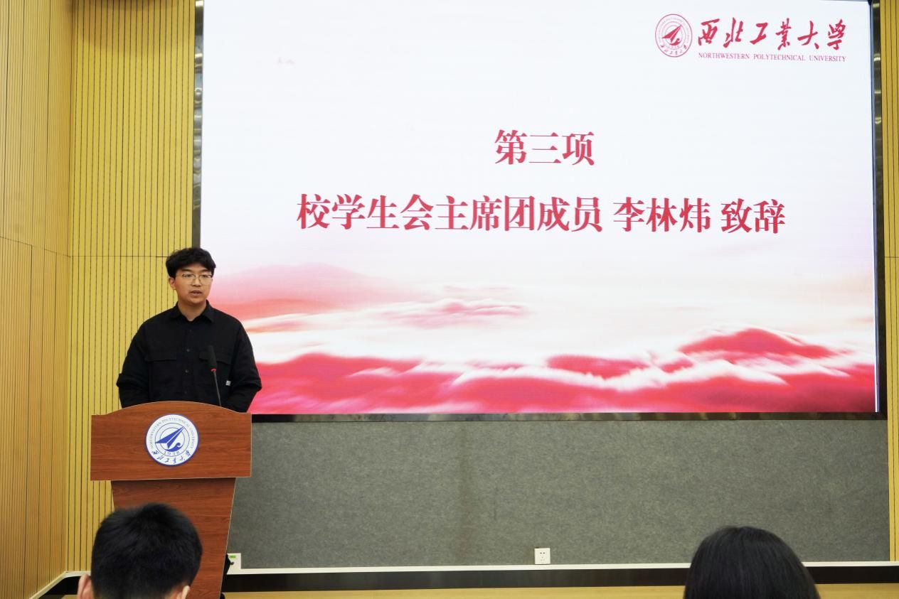 校学生会主席团成员李林炜致辞,向大家提出三点希望:一是勤于学习、善于学习,二是落实权益、保障到位,三是巩固成果、确保实效,并祝愿十点半